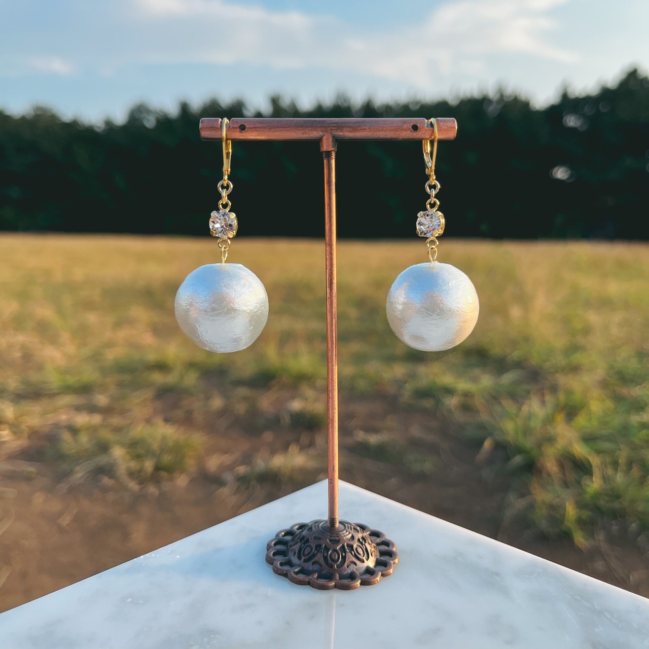 大きなコットンパールと繊細なクリスタルガラスを組み合わせたアクセサリー。