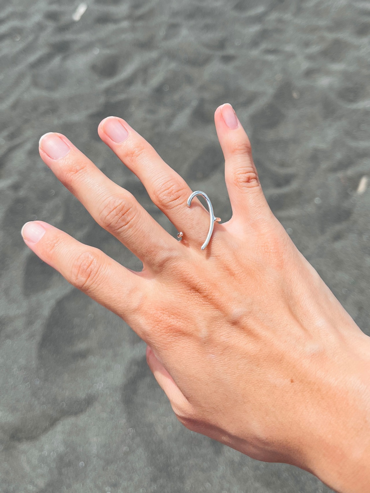 「ヘ音記号」のような不思議な造形のリング。
